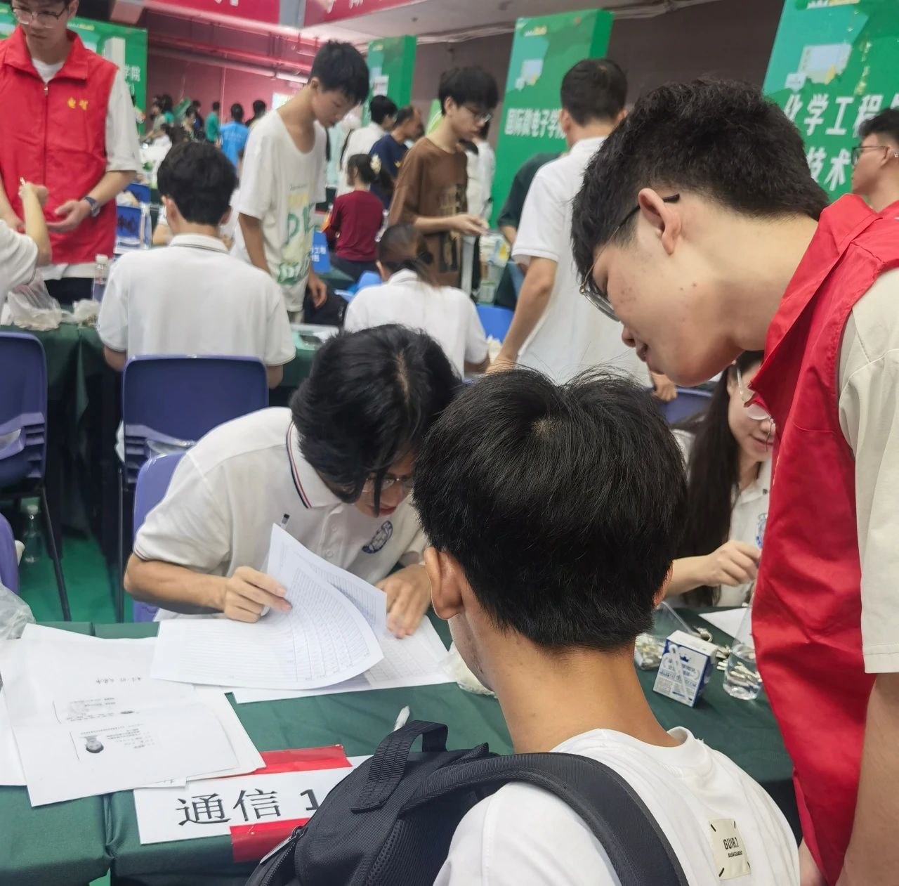 迎新现场,学院老师、助理班主任和迎新志愿者们分工协作,为新生办理各项入学报到手续。