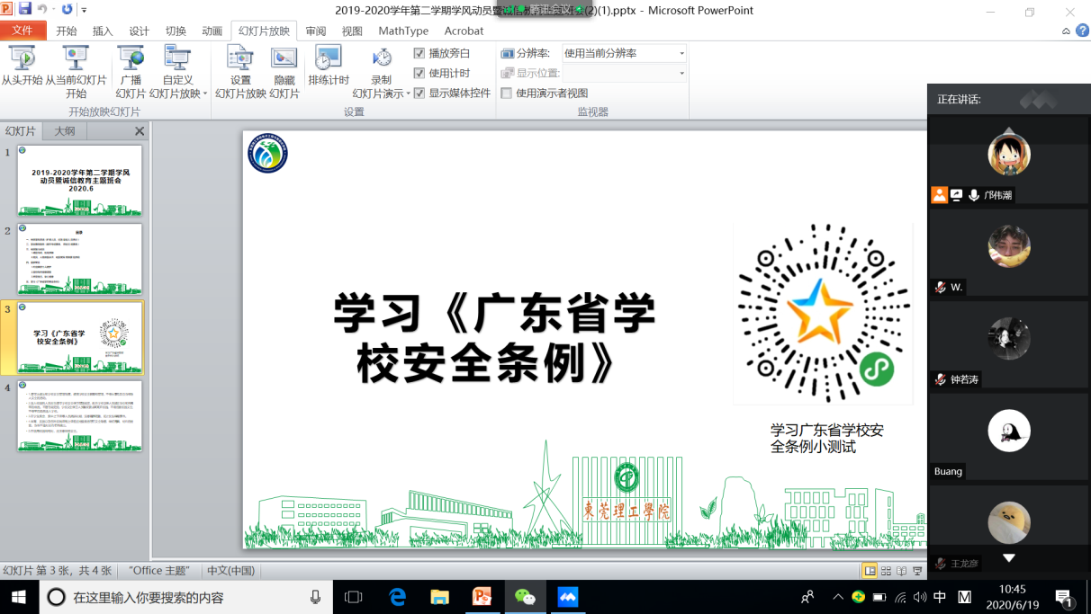 全体班主任通过组织召开《学习广东省学校安全条例》主题班会,进行线上集中学习,并组织全院学生自主完成的线下学习。为检验学习效果,学院选取条例重点内容,编写有关条例学习情况的小测试,全院同学积极参与,其中有625位同学获得满分。