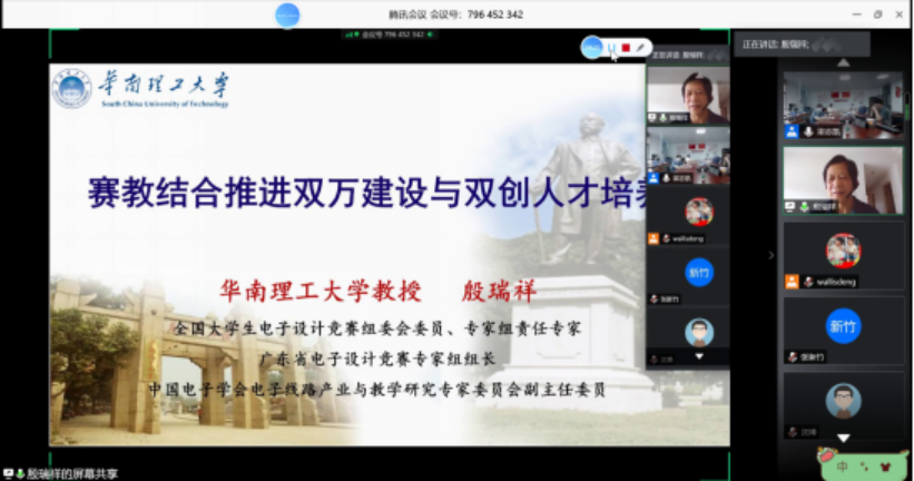 讲座中,殷教授重点围绕双万计划及其建设的核心、双创人才的培养、全国大学生电智设计竞赛概况以及赛教融合的培养方法等四个方面,层层递进地分享了如何结合双万计划的背景和双创人才的培养目标,通过以电子作品设计比赛为代表的各类专业竞赛,探索赛教融合进行人才培养的方式方法。