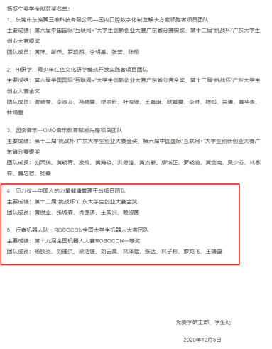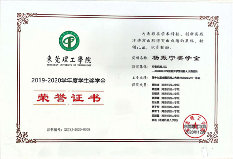 比赛队伍“行者机器人队——ROBOCON全国大学生机器人大赛团队”,成功在校内各优秀团队中脱颖而出,荣获“杨振宁奖学金”。
