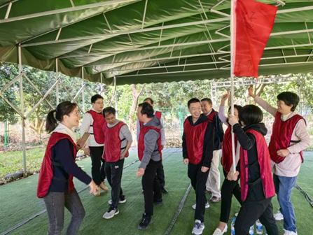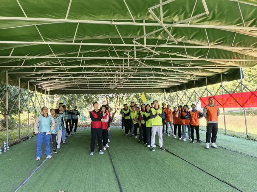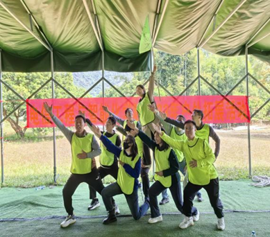 活动现场,在拓展教练的指挥下,破冰团建热身活动很快拉进了大家的距离感,来自学院不同部门的教职工们迅速组成4支拓展队伍,绿鹰队、雄狮队、猛虎队、神风队响亮的队名尽显教职工风采。接着,队员们自创队旗、口号,以别出心裁的造型亮相,展示各自团队实力。