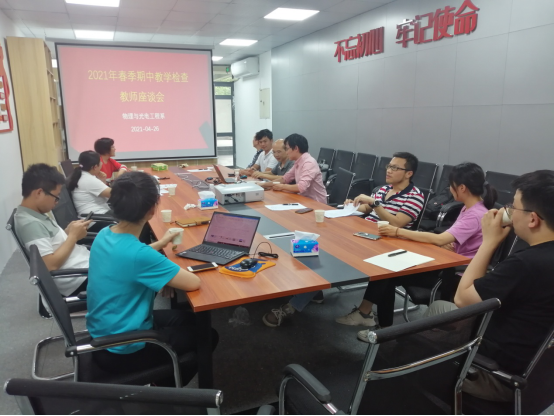 4月26日下午,物理与光电系召开2021年春季期中教学检查教师座谈会,就教学中存在的问题、新进教师培训、系的事务性工作部署等事项进行了探讨。