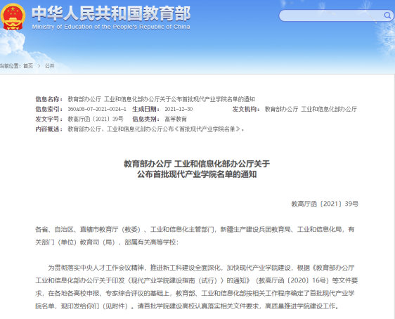 为扎实推进新工科建设再深化、再拓展、再突破、再出发,协调推进新工科与新农科、新医科、新文科融合发展,全面提高人才培养能力。2020年,教育部、工业和信息化部颁布《现代产业学院建设指南(试行)》,并指出以区域产业发展急需为牵引,面向行业特色鲜明、与产业联系紧密的高校,重点是应用型高校,建设一批现代产业学院。在此基础上,引导高校瞄准与地方经济社会发展的结合点,不断优化专业结构、增强办学活力,探索产业链、创新链、教育链有效衔接机制,建立新型信息、人才、技术与物质资源共享机制,完善产教融合协同育人机制,创新企业兼职教师评聘机制,构建高等教育与产业集群联动发展机制,打造一批融人才培养、科学研究、技术创新、企业服务、学生创业等功能于一体的示范性人才培养实体,为应用型高校建设提供可复制、可推广的新模式。
