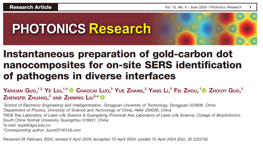 刘晔教授课题组博士后郭艳先以第一作者身份在学校T类二级期刊《Photonics Research》以“Instantaneous preparation of gold-carbon dot nanocomposites for on-site SERS identification of pathogens in diverse interfaces”为题发表研究论文,东莞理工学院刘晔教授与华南师范大学刘智明教授为共同通讯作者。《Photonics Research》为中科院光学一区TOP期刊,影响因子为7.6。