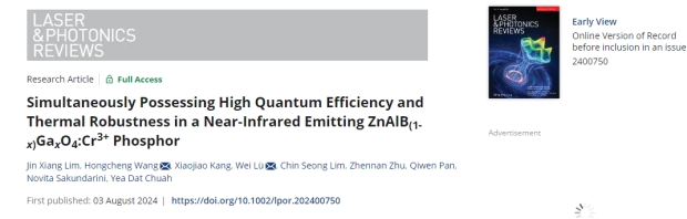 王红成教授团队研发了一种同时兼具高量子效率和超高热稳定性的近红外发光材料。该研究在《Laser & Photonics Reviews》(影响因子:9.8,中科院1区TOP期刊)上发表题为“Simultaneously Possessing High Quantum Efficiency and Thermal Robustness in a Near-Infrared Emitting ZnAlB(1-x)GaxO4:Cr3+ Phosphor”的研究论文。这篇论文的第一作者林金祥是我校与诺丁汉大学马来西亚校区的联合培养博士生,迪士尼彩乐园