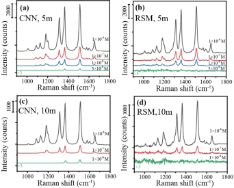 基于上述训练好的CNN模型,我们利用实验室发展的激光诱导蒸发自组装法制备了系列纳米颗粒团簇结构光纤SERS探针,测量了1 m、5 m、10 m距离的远程SERS光谱,并比较了CNN法和传统参考光谱法(RSM)的拉曼背景去除效果。结果表明,CNN法比RSM法的检测灵敏度高一个数量级;利用CNN法实现了10 m长度下10-8 mol/L的Rh6G溶液的液相高灵敏、快速检测。该工作为SERS光谱的远程痕量检测提供了一种可行方案,在危险物质检测和远程环境监测中展现出重要应用前景。