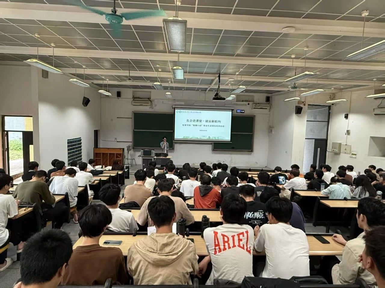 2022级就业指导课堂上人头攒动,学院实习基地华勤技术、视源股份两家企业进入课堂为同学们带来了精彩的就业指导讲座。华勤技术人力资源经理眭维、招聘主管赵莉、马玟,校友李星梓,视源股份HR王艺霏、校友范乾煊进入就业指导课堂,为学生提供“一站式”求职赋能。