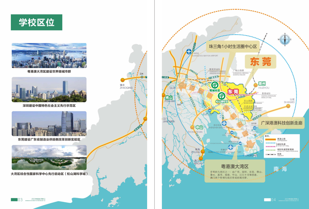 现有松山湖、莞城两个校区,其中松山湖校区坐落在松山湖高新技术产业开发区大学路1号,占地1800多亩(含370亩国际合作创新区);莞城校区坐落在莞城区学院路251号,占地330多亩。