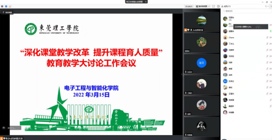 为进一步落实推进课程思政建设工作,2022年3月15日上午,电子工程与智能化学院通过线上会议形式召开教育教学大讨论工作会议,学院党委书记兼执行院长胡耀华、党委副书记梁意红、副院长宋跃、副院长胡君、各系部主任、副主任、党支部书记、教研室负责人等相关人员参加了会议,会议由胡君主持。