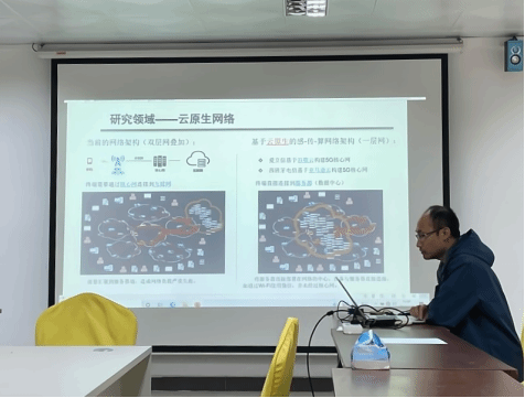 梁辉副教授首先对基于网络孪生的新型智能网络架构技术与试验平台项目进行了总体介绍,阐述了当前网络架构所存在的问题,同时分析了未来基于云原生的感-传-算一体化新型网络架构。随后,针对该项目的核心问题进行了详细讲解,分别从体系架构设计、资源管理调度与软硬件实现三个方面展开,给出了具体技术实现细节。最后,与参会师生进行了热烈的讨论,耐心细致地解答了大家的问题。
